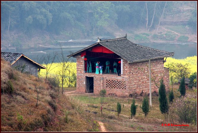 為期近一月的 “中國綠色菜都第二屆菜花節”,其景區主要在崇龕鎮的青杠村、老店村、古泥村、白沙村。崇龕鎮地處潼南縣的西北邊陲,是四川省遂寧市、安岳縣和重慶市潼南縣三市縣的結合部,瓊江河四十五公里縱貫全境,全鎮幅員面積八十七平方公里。據載,崇龕原名為隆龕,自隋代開皇三年(公元583年)建鎮,距今已有一千四百多年歷史,其間曾設立縣城,縣址在瓦子堡。616年,隆龕鎮升建為隆龕縣,712年因避唐玄宗李隆基名諱,改名崇龕縣, 967年,崇龕縣降為崇龕鎮,境內史家壩是古縣城的遺址。民國時期仍然名為崇龕鎮,又叫漏孔場。1951年建崇龕鄉,1967年改名光輝,2001年再次復名崇龕。站在鎮外的煙波嶺上,居高而望,崇龕鎮盡收眼底。鎮上有玉佛路、獅泉上路、獅泉下路、濱江路、恩威路、明月路、老街共七條街道。進出崇龕鎮的五條干道柏梓、姚市、大安、雙江、龍臺的公路均是水泥混凝土路面,交通十分方便。游覽中,我們在白沙村時,老遠老遠就聽見了青龍寺里傳出的不是阿彌陀佛的聲音,而是“……我看見一座座山一座座山川……”《天路》中的主題歌《青藏高原》,那歌聲憨實的飄下山來,傳得很遠很遠。站在青龍臺上,遠遠地看見山下的白沙村青龍寺老年文藝活動室的土臺上,正在演著戲劇,雖然沒有幾個觀眾,可是他們演得還是那樣的認真,那樣的一絲不茍。晚飯后,我們在鎮上閑逛,看見了多年沒有看見了的露天電影。一位居民告訴我們,過年時也放過,從油菜花節開幕以來,已經放演了好幾天了。我們想照幾張照片,卻沒有帶腳架,端不住相機。一位擺攤的居民忙說,把相機擱在小攤架上。于是,我依托小攤架勉強照了一張,效果不太好。