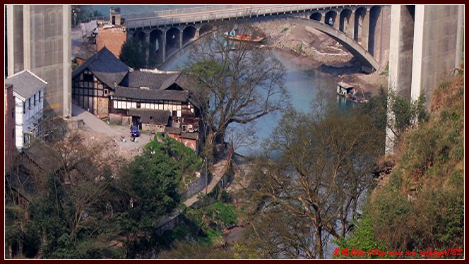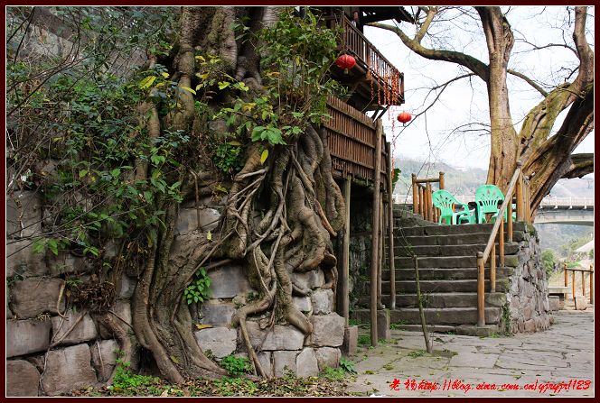 東溪的交通是十分方便的。明朝成化年間的川黔青石板古道穿場而過,現在的210國道和渝黔高速公路縱貫全境。于是,一座古老的王爺廟就落在了渝黔高速公路的高架橋下。王爺廟背靠210國道,頭頂渝黔高速公路,腳抵川黔石板古道,面臨東溪河,依山傍水。廟里已經沒有什么菩薩可敬了,但是,廟還是保護得挺好的。一打聽,原來鎮上為保護王爺廟就將廟租賃給了一位餐飲老板。于是,年輕的老板在廟里開起了飯館和茶館。正好也過午飯時間,我們也干脆在廟里點了四樣菜。一會兒功夫,菜上來了,其口味也挺好的。飯后,我們圍著寺廟轉了轉,發現王爺廟建在河邊,門前有兩棵黃桷樹。飯館老板說,那黃桷樹的年代與王爺廟一樣長,建廟時就栽下了兩棵黃桷樹。當時,建廟人為保護黃桷樹,防止被水沖走,用條石砌成堡坎將黃桷樹護在中央。然而,今天,我們看見的已經不是石護樹了,而是黃桷樹的根把條石緊緊地摟在了懷里,護在了身下。我感慨,樹都知道報恩,何況人呢!