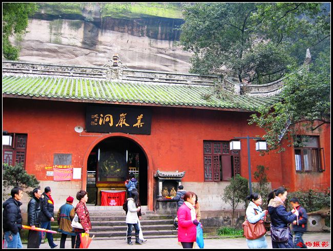 離開大雄寶殿一路下山就來到了華巖洞前。華巖寺的始建年代雖然無史可考,但是其“華巖”之名卻是因寺南側(cè)有一華巖洞而得。起初因山巖有洞,澗泉飛濺,狀如散花,遂以“花巖”為洞名,后改“花巖”為“華巖”,而后依洞建寺,以華巖洞著稱,亦沿稱華巖寺。華巖寺流傳著不少神奇的傳說,最著名的是“金雞筑巢”和“袈裟蔽日”。華巖洞即小寺,依山而建,與大寺隔湖相望,為華巖寺之祖廟。據(jù)華巖寺志載:“巴縣之西有伽藍(lán),曰華巖。明萬歷已亥,里人楊益延僧無權(quán)復(fù)建。”華巖寺屬佛教禪宗,自圣可大師首任住持以來,已傳六十四屆。石刻觀音,達(dá)摩佛像系畫圣吳道子白描珍品。五百羅漢雕像別具一格,每尊高不過一尺,寬約七寸,全部妙相以柳木鏤空浮雕而成,造于清嘉慶年間,乃佛教藝術(shù)之瑰寶。在深邃幽靜的華巖古洞右邊,有一尊石刻大乘臥佛——釋迦涅磐圣像,長約3米,神態(tài)安詳,左邊半崖上有刻于清同治年間的“有龍則靈”四個大字。