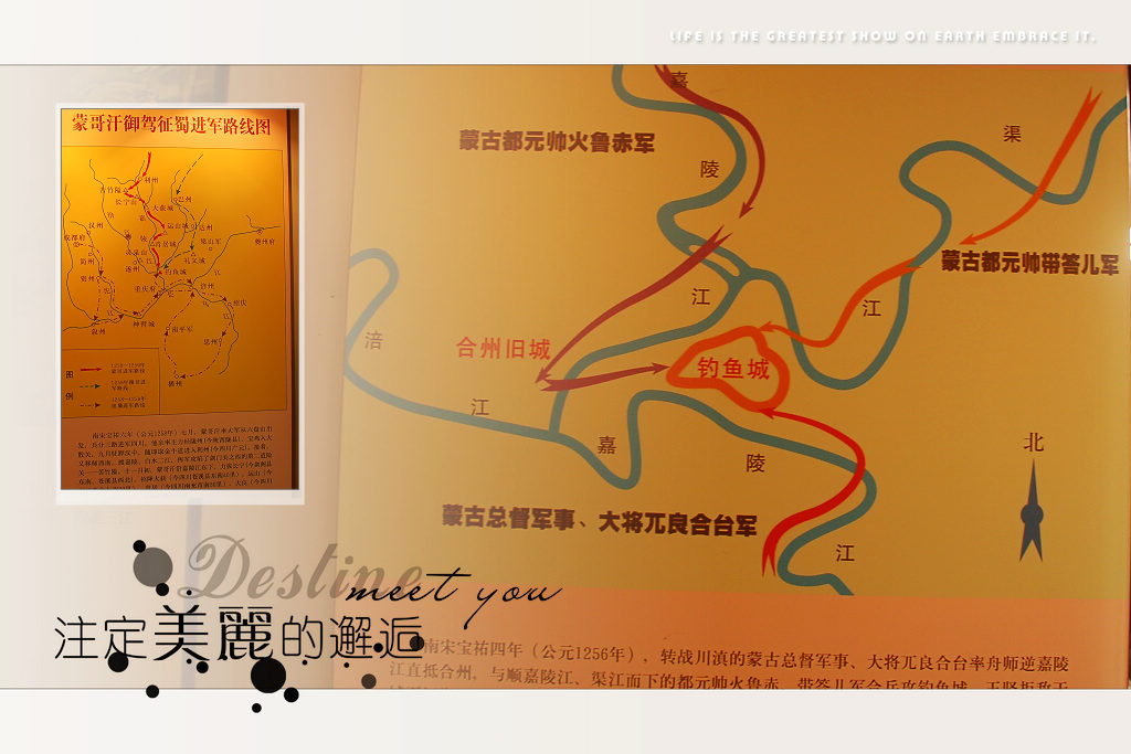 資料:“1234年宋、蒙聯合滅金后,南宋出兵欲收復河南失地,遭蒙軍伏擊而失敗。1235年,蒙古侵略軍在西起川陜、東至淮河下游的數千里戰線上同時對南宋發動進攻,宋蒙戰爭全面爆發。至1241年,蒙軍蹂躪南宋大片土地,而四川則是三大戰場(另兩個為京湖戰場——今湖北和河南一帶、兩淮戰場——今淮河流域一帶)中遭蒙軍殘破最為嚴重的一個地區。這年蒙古窩闊臺汗去世,其內部政爭不斷,對南宋的攻勢減弱。南宋充分利用此良機, 對各個戰場的防御進行調整、充實。1242年,宋理宗派遣在兩淮抗蒙戰爭中戰績頗著的 余玠入蜀主政,以扭轉四川的頹勢,鞏固上流。余玠在四川采取了一系列政治、經濟和 軍事措施,其中最重要的是創建了山城防御體系——即在四川的主要江河沿岸及交通要道上,選擇險峻的山隘筑城結寨,星羅棋布,互 為聲援,構成一完整的戰略防御體系。釣魚城坐落在合川城東5公里的釣魚山上,其山突兀聳立,相對高度約 300米。山下嘉陵江、渠江、涪江三江匯流,南、北、西三面環水,地勢十分險要。這里有山水之險,也有交通之便,經水路及陸上道,可通達四川各地。1243年,余玠采納冉琎、冉璞兄弟建議,遣冉氏兄弟復筑釣魚城,移合州治及興元都統司于其上。釣魚城分內、外城,外城筑在懸崖峭壁之上,城墻系條石壘成。城內有大片田地和四季不絕的豐富水源,周圍山麓也有許多可耕田地。這一切使釣魚城具備了長期堅守的必要地理條件以及依恃天險、易守難攻的特點。1254年,合州守將王堅進一步完善城筑。四川邊地之民多避兵亂至此,釣魚城成為兵精食足的堅固堡壘!