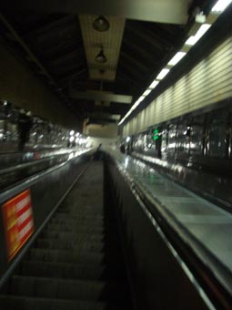 進房安排好,3點鐘出來,首先一件事便是買回程票(頭天晚上已經(jīng)與北京商量好,如果買不到T10,就訂飛機票)。前臺告訴我:出門左手5步下地下通道,去火車站、乘皇冠電梯均可;疖嚻比绱撕觅I,心定一大半,旁邊就是汽車站,去打聽明天去大足的票,人少,服務員耐心,對重慶的好感大增!短信發(fā)回北京后,信馬由韁地逛去。地下通道的另一站直接是皇冠電梯的入口,買了票才知道這個攜程告訴的電梯原來本名叫做“兩路口電梯”。初上電梯并不覺得危險,不久見對面向下的男女老少都扶著扶手,轉身一望,不由自主地晃了一下:好高。≡共坏脭y程把它當成地標呢。
