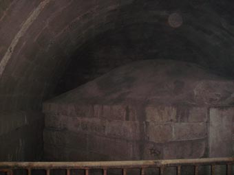 還是什么都看不見(jiàn),我把數(shù)碼的閃光燈打開(kāi),舉起來(lái)就是一張,回放一看倒嚇了自己一跳:赫然一個(gè)大墓!雖然不太正,但肯定是巴蔓子墓。黑洞里仍然看不清,根據(jù)已拍的照片,估摸著調(diào)了調(diào)位置,又是一張、一張、一張……這時(shí)的眼睛已經(jīng)基本適應(yīng)黑洞了,大到可以看到高不及腰的攔桿和墓碑了。