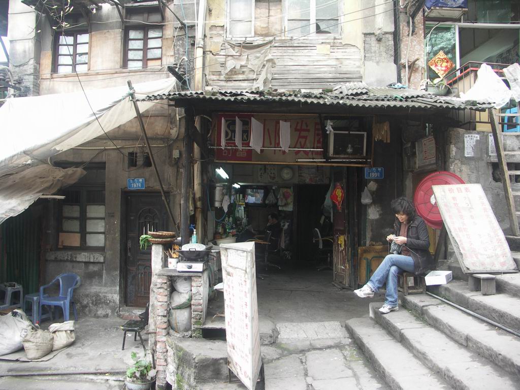 這里是這個城市底層生活的概煉。長長的臺階兩邊鱗次櫛比地分布著兩、三層的下店上宅的老屋。屋子都是自行塔建的,破爛隨意,卻各不相同。有磚有木,也有混凝土的。從一棟房子身上,也能輕易看出數次改造的痕跡。感覺像上海南市的棚戶區。