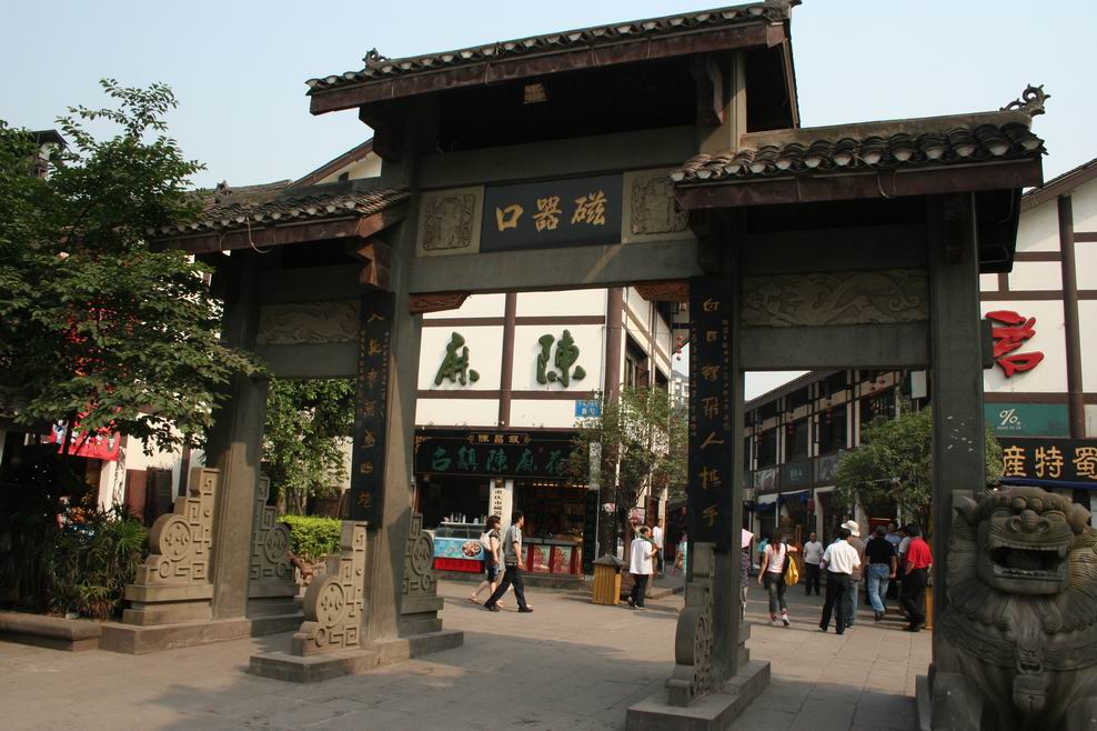 古鎮磁器口有12條街巷,街道兩旁大多是明清風格的建筑,地面由石板鋪成,沿街店鋪林立。商貿集中在大碼頭和靠碼頭的金蓉正街。嘉陵江中上游各個州、縣和沿江支流的農副土特產在此中轉集散,重慶城的一些大商客在碼頭設店收購。輸出以棉紗、布匹、煤油、鹽糖、洋廣雜貨、日用百貨、五金顏料、土碗土紙和特產煙絲等為大宗。在重慶作為陪都時期,據統計有商號、貨棧和各種作坊達1670多家,攤販760多戶。每天都有300多艘(船均載重10噸)貨船進出碼頭。全年中商貿最興旺的是枯水季節(舊歷八月至次年四月),碼頭河壩搭建起臨時街道,有上河街、中河街、下河街,還有專業性的木竹街、鐵貨街、陶瓷街和豬市、米市。碼頭上萬商云集,擁擠不通。除大碼頭外,還有歷史悠久的4家絲廠,一家制呢廠,24兵工廠(現特鋼廠),25兵工廠(現嘉陵廠),都設有自己的貨運碼頭。碼頭上從早到晚,水陸兩路,商旅川流不息,裝卸搬運,絡繹不絕。行商坐商,批零量購,貨暢其流。大碼頭右側的豆芽灣,是米糧幫、木材幫、篾貨幫、煤炭幫的地盤。與碼頭河街相鄰的是鐵貨街、豬市、雞鴨蛋市和鹽市口。各行業的同業公會都有事務所,食品糕點業26家,棉紗布業20家,茶館酒館116家。昔日磁器口碼頭的繁榮景象,至今還深深地留在“老重慶”的記憶里。當年留傳這樣一首民謠:“白日里千人拱手,入夜后萬盞明燈。”“千人拱手”:是形容每天都有上千只船上的舶公和船夫劃著船向碼頭停靠。“萬盞明燈”:是指形容碼頭上商賈云集,入夜后各自點亮油壺、電石燈和汽燈如繁星閃爍。1997年,重慶新發行的一套《最后的回憶》地方磁卡,與解放碑、通遠門、臨江門并列的就是磁器口大碼頭,有“小重慶”之稱,現在依然可見國民黨主