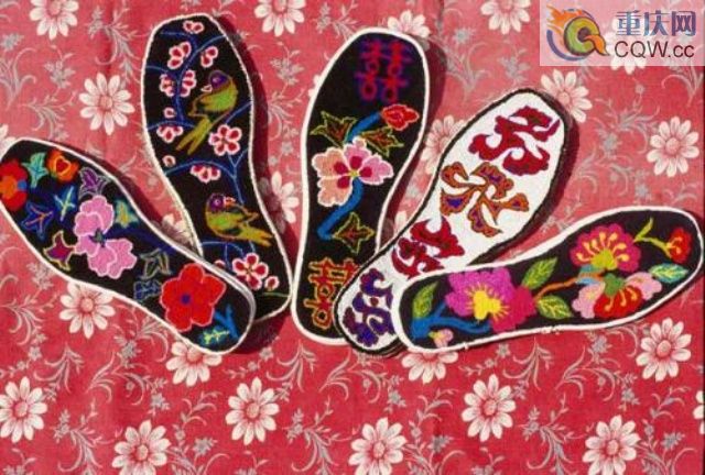 神女繡花鞋墊,是三峽村姑一針一線繡納而成。鞋墊內由多層棉布打底,后用五顏六色的彩棉線,繡出三峽傳統圖案。該鞋墊舒適,透氣性能好。